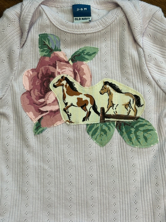Running Horses & Rose on Lavender Pointelle Onesie, Size 3-6 mons.
