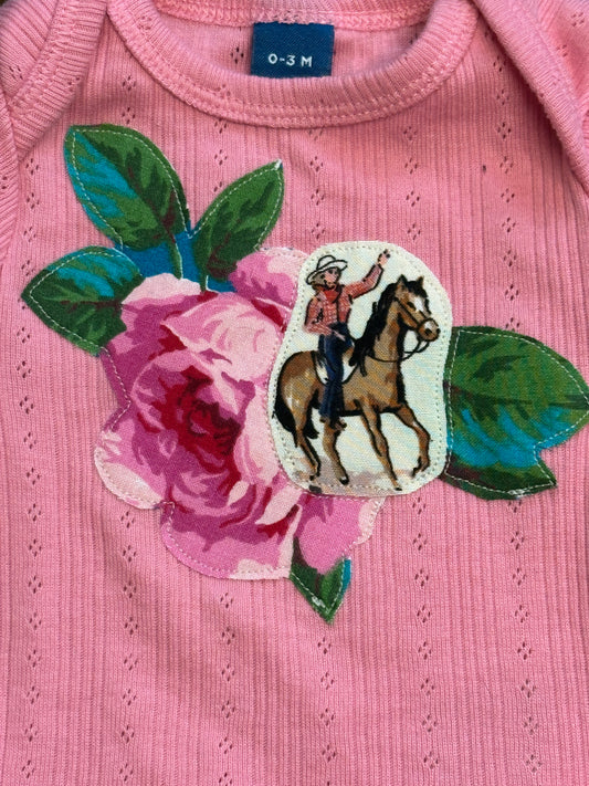Vintage Cowkid & Roses on Pink Striped Onesie, Size 0-3 mons.