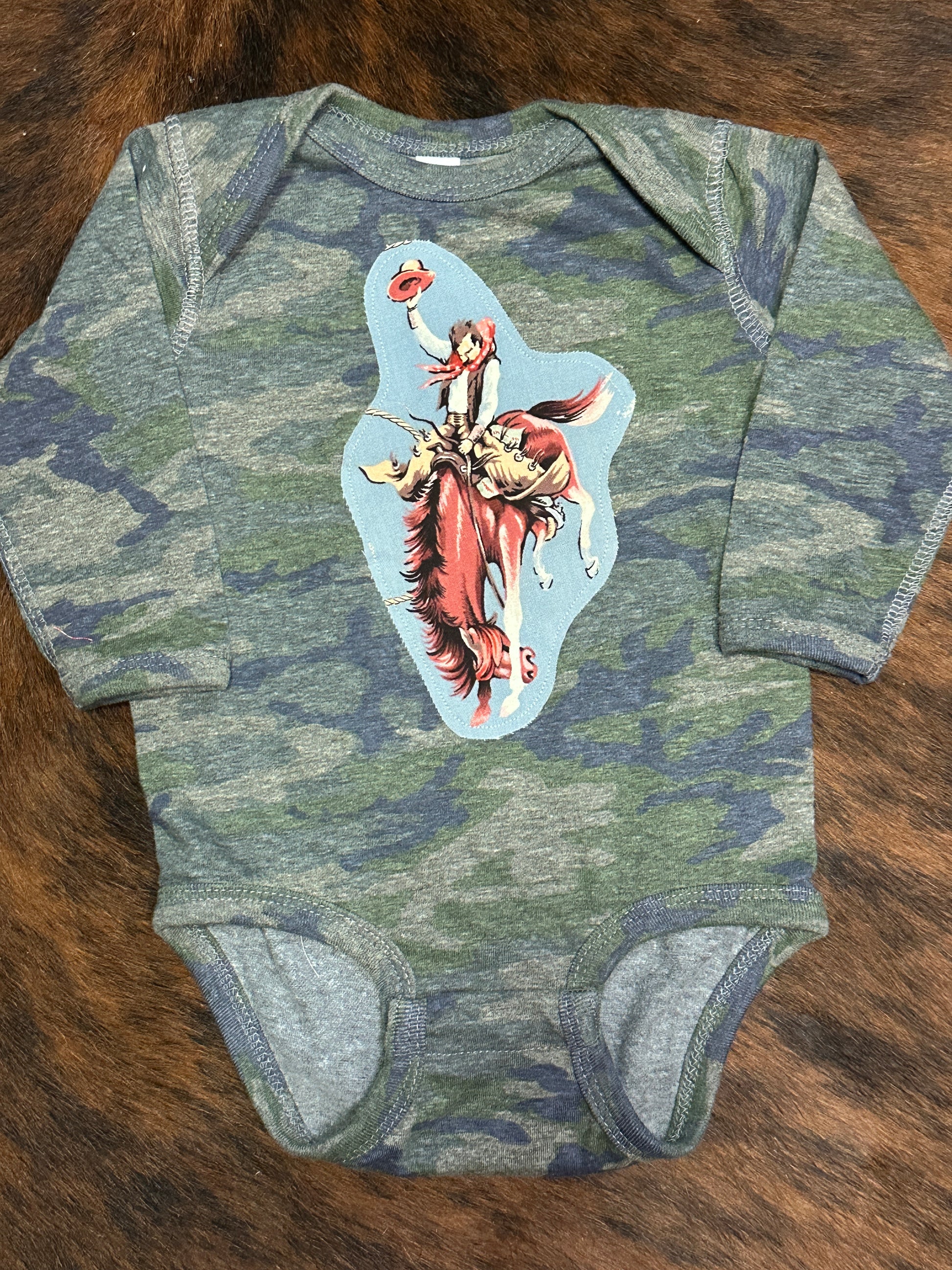 This classic image of an iconic bronc buster is the central feature on this camo long sleeve onesie.
