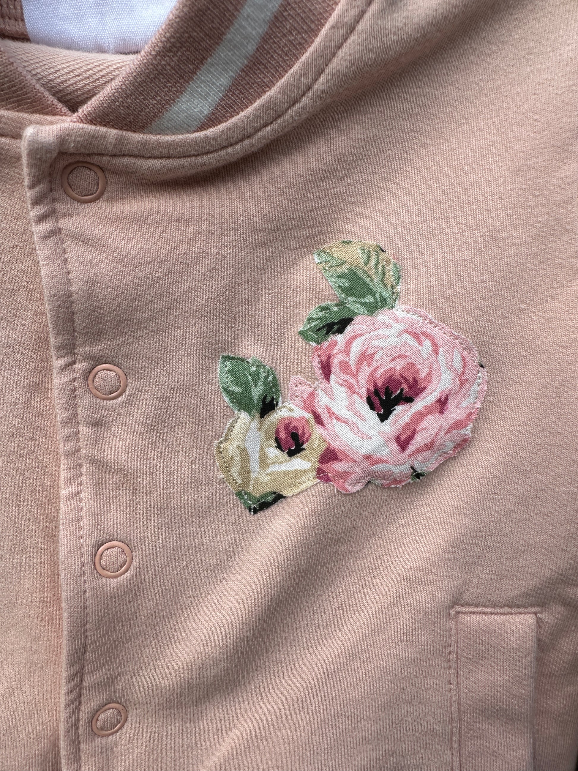 These are light pink letterman style jackets by Angel Dear. All of these jackets are the same size. (See lower note for other sizes.)