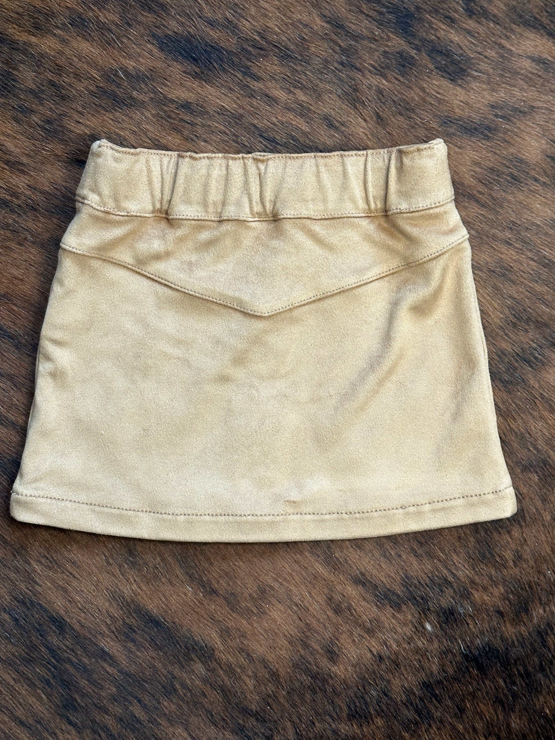 A perfect tan faux suede western skirt acts as the backdrop to stunning deep red roses and tiny bucking broncs.