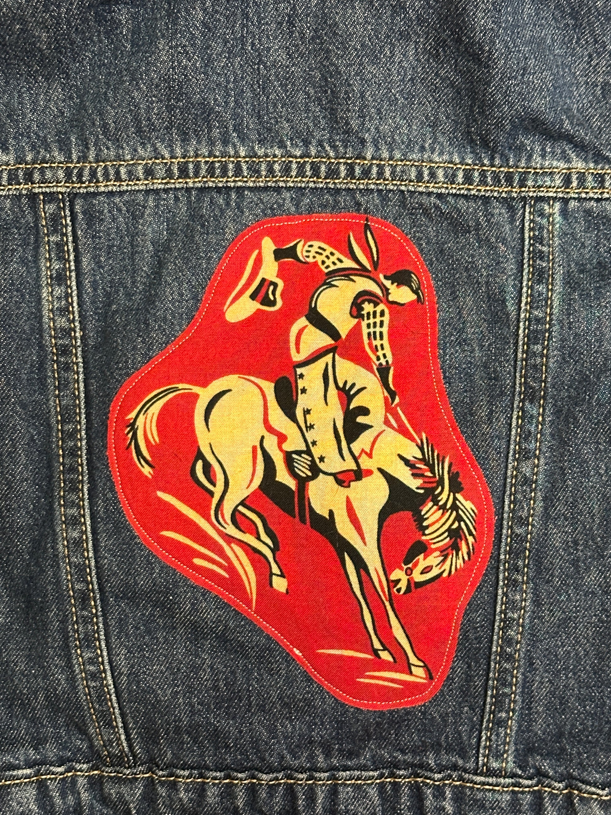 The classic jacket with another classic addition- this denim sherpa lined jacket is paired with a vintage bronc rider to top it off.